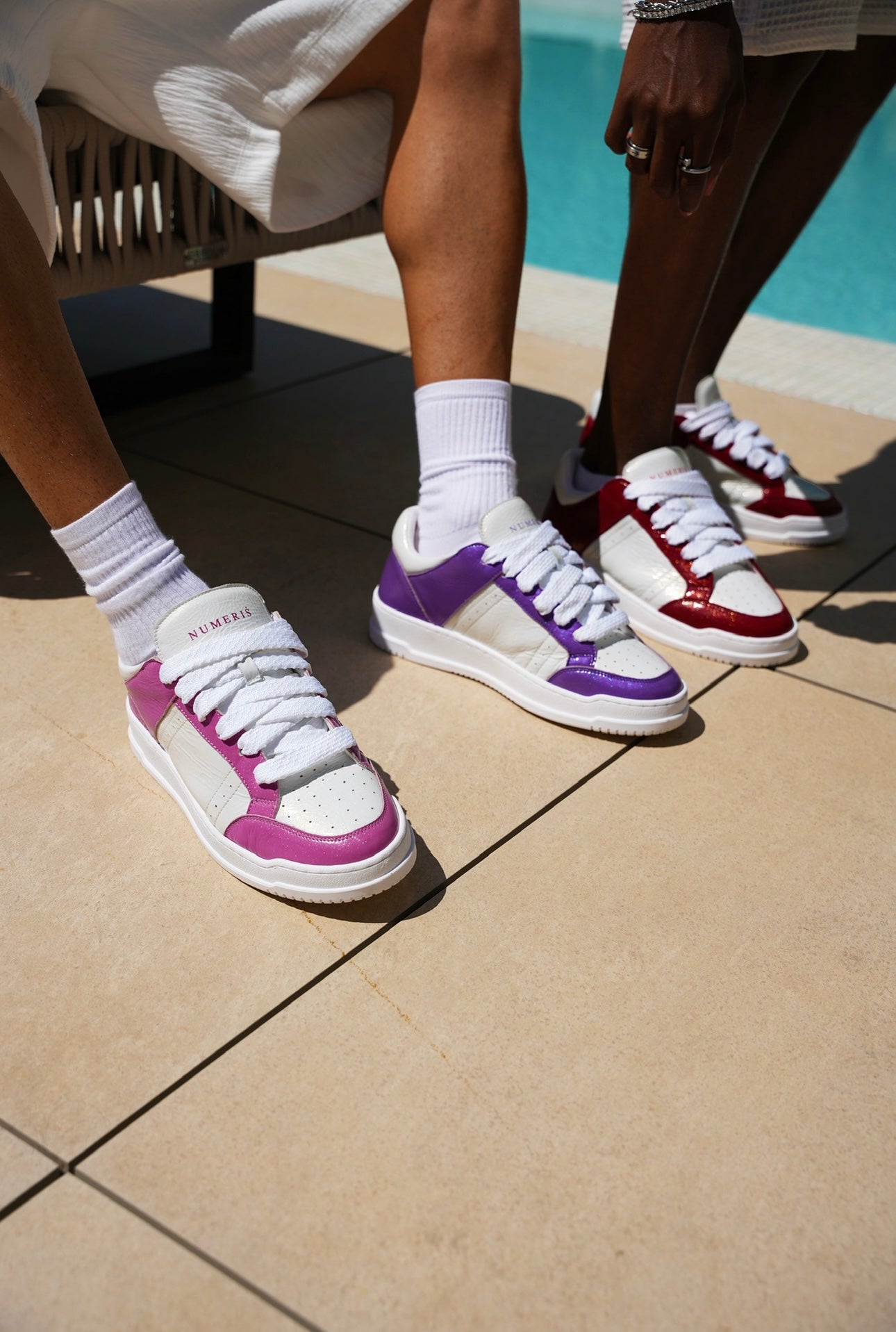The Arena Sneaker combines everyday luxury and sportswear aesthetic. Arriving in vibrant colorways, the Magenta colourway features a full glossy Italian leather upper. With one shoe being pink and the other purple - which is complimented with white textured 10mm laces. The interior of the trainer features collar lining providing unrivalled comfort. The upper rests perfectly on top of our custom white sole. The sole itself features Numeriś branding embossed on the rear and is engraved on the under-sole.
