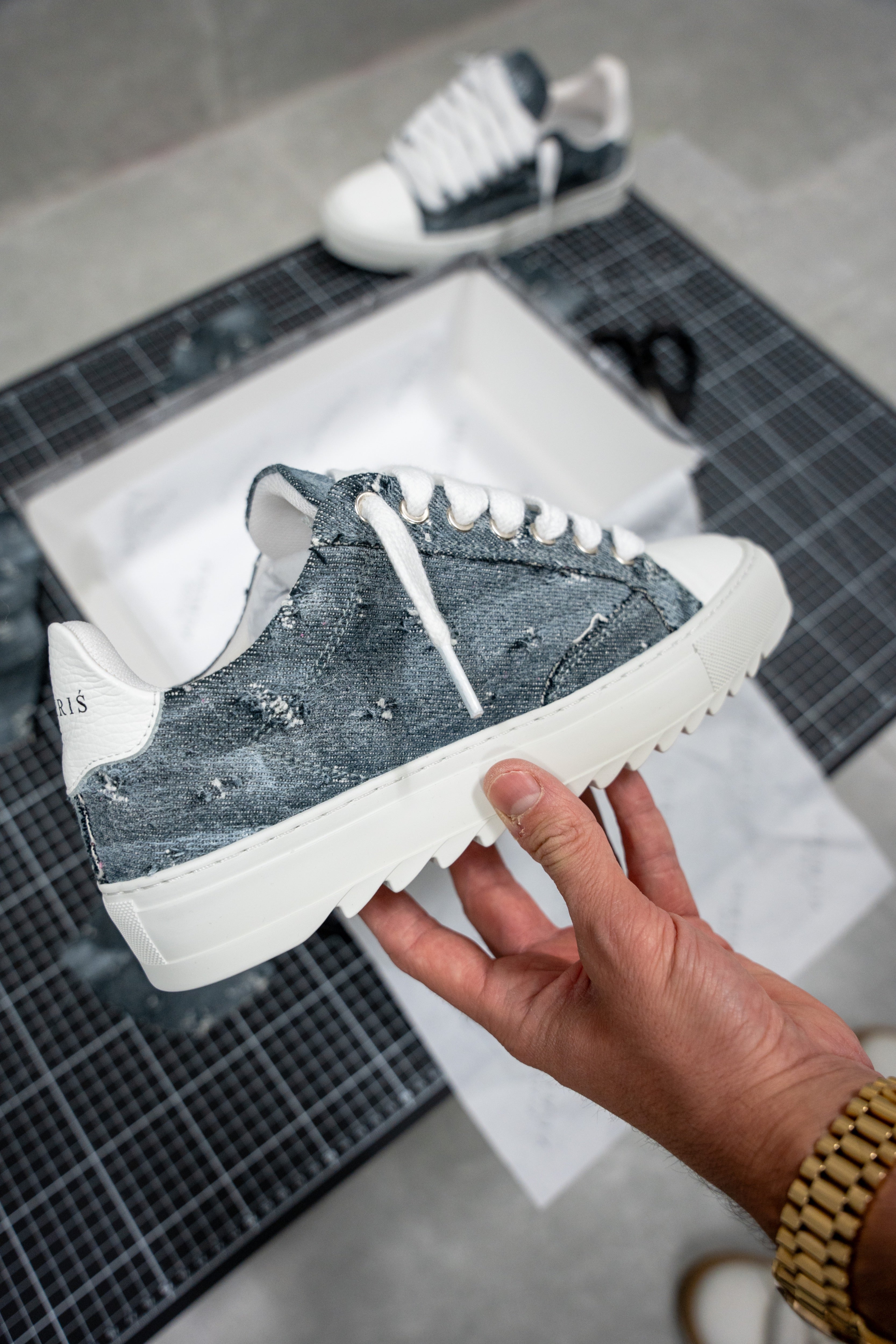 The Thrashed Denim trainer is a celebration of freedom and self-expression. Crafted with meticulous attention to detail, its bespoke hand-distressed washed denim upper is the result of an extensive development process. It took time to perfect the ideal wash, carefully refining techniques to achieve the signature "thrashed" look—ensuring a balance of character and wearability. This dedication to detail means no two pairs will ever bear the same distressed pattern, making each one a unique work of art. Complementing this distinctive feature is the signature crisp white pebbled leather toe cap, adding a touch of sophistication to the design. Inside, the trainer boasts a comfortable collar lining that enhances the overall wear experience. The finishing touches include our distinctive Numeriś branding on the heel, accompanied by the style-defining slogan, 'Design is thinking made visual.”